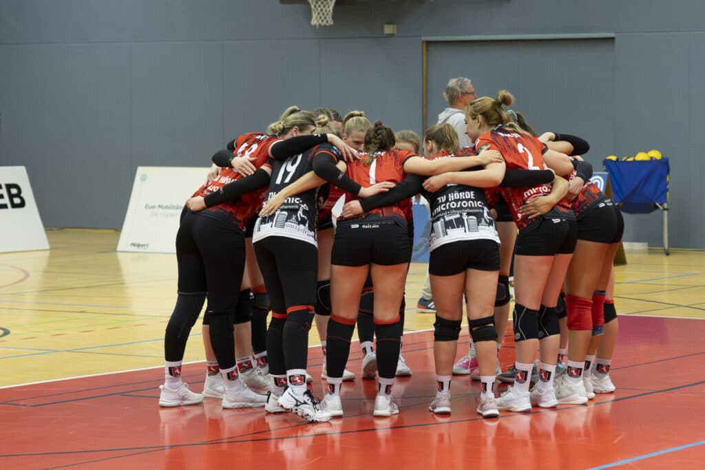 Von einem spürbaren Heimvorteil war zunächst wenig zu merken. Bereits im ersten Satz landeten mehrere Bälle an der – nicht allzu hohen – Hörder Hallendecke. Zudem setzte Oythe die Gastgeberinnen mit druckvollen Aufschlägen stark unter Druck, sodass die Annahme nicht immer sauber gestellt werden konnte. Dennoch fanden die Hörderinnen zunehmend Lösungen gegen das Spiel der Gäste aus Niedersachsen. Trotz des mittlerweile fast schon gewohnten holprigen Starts bewiesen die Rothemden großen Kampfgeist und arbeiteten sich wieder heran. Am Ende zeigte sich jedoch die Konstanz des Tabellendritten, sodass der Satz mit 19:25 abgegeben werden musste.